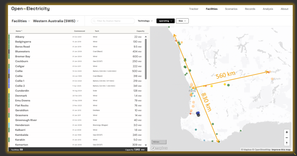 The first is from Open Electricity: a list of every large generator in Western Australia, 59 facilities in total. A handful of coal plants, some wind farms, a few big solar and battery sites. You could fit the entire list on a single printed page. The map shows neat, coloured dots scattered across the state, with distances measured in hundreds of kilometres. Manageable.