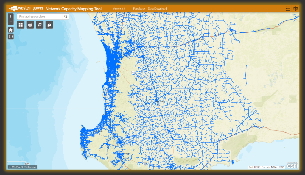 The second map is Western Power’s Network Capacity Mapping Tool. Zoom in anywhere in the south-west and you see a dense, spider-web explosion of blue lines, every single low-voltage feeder, every distribution transformer, every possible connection point. Millions of endpoints. Rooftop solar, home batteries, EV chargers, smart hot-water systems. The “facilities” are no longer 59. They’re every house on every street.